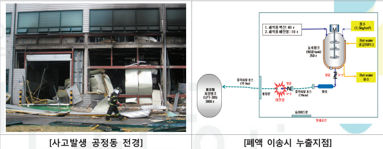 재해개요2014년 2월 13일(목) 13시 4분경 경기도 남양주시 소재 000(주) 급속동결실 내부 유니트 쿨러의 코일에서 핀홀이 생겨 냉매인 암모니아 가스가 누출되어 체류하던 중, 원인 미상의 점화원에 의해 폭발이 발생하여 근로자 1명이 사망하고 3명이 부상당한 재해임 재해발생과정■ 재해발생공정 : 급속동결 공정- 공정설명 : :① 원유가 입고되면 첨가제 배합 후 살균•저장 -> ② 아이스크림 형들에 반제품 충진하여 컨베이어를 통해 급속동결실(-30C)로 이송 -> ③ 급속동결 후 포장실에서 포장 후 냉동 창고에 보관- 폭발발생공정 : 냉동기계실에서 냉매인 암모니아를 압축•응축한 후 배관을 통해 급속동결실에 설 치된 증발기(유니트쿨러, 설계온도 47°C)에서 초저온 공기를 송풍하여 급속동결실 온도를..